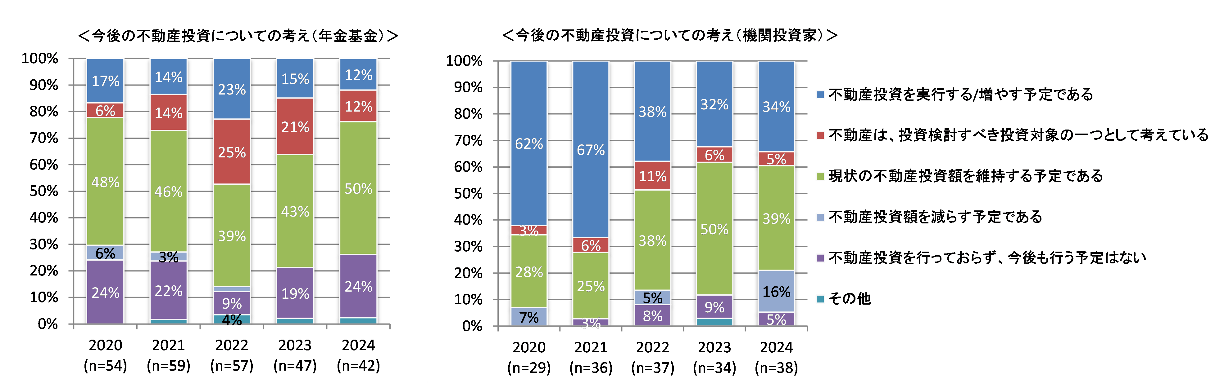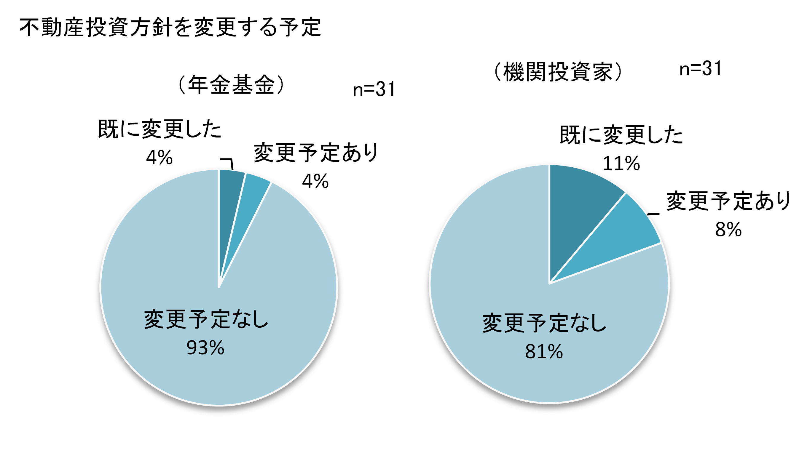 - 今後の不動産投資方針については、年金基金、機関投資家ともに「現状の不動産投資額を維持する予定である」との回答が最多となり、特に年金基金では50%に増加した。年金基金では「投資を実行する/増やす予定」「投資検討すべき投資対象の一つ」がいずれも減少、両者の合計は24%となった。機関投資家でも両者を合わせた積極姿勢の投資家の割合が39%と、調査開始以来最少となった前回調査とほぼ同水準となった。年金基金及び機関投資家ともに不動産投資を拡大する意向を持つ投資家が減少している。