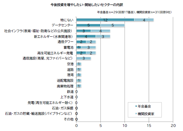 ・年金基金では「特にない」 が半数以上を占めるが、投資対象を明示した中では「データセンター」が最多、次いで「新エネルギー」であった。機関投資家でも「データセンター」が最多となり、「社会インフラ」が続いた。一方、これまで上位を占めてきた「再生可能エネルギー発電」への関心はやや後退した。「再生可能エネルギー発電」に代わる投資対象を模索する傾向が表れている。