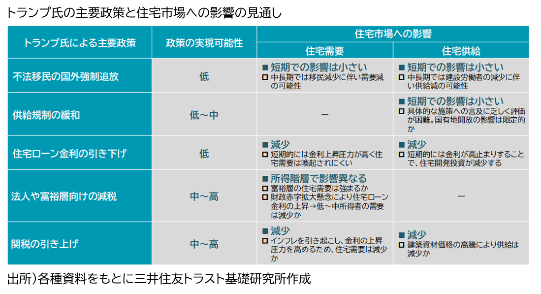 今後、民主党から共和党のトランプ氏に政権が交代することで、外交、経済対策から移民問題に至る様々な分野において、これまでのバイデン政権から政策方針が大きく転換されることが想定される。本稿においては、トランプ氏の選挙戦における公約や、これまでの同氏の発言などから、今後実施される可能性が高い政策を整理し、昨今、低下が懸念される住宅アフォーダビリティ(購入のしやすさ)への影響について考察する。