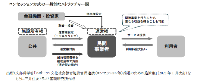 近年、国内のスキー場の4割強が赤字となっている。この原因として、①需要(スキー・スノーボードの参加人口)に対して供給(スキー場の数)が過剰な状態であること、②インバウンドなど多様化するニーズに対して施設の対応が遅れていることの2点が要因として考えられる。①については業界全体で取り組むべき課題である一方、②については事業者単位で取り組むべき課題であり、加えてこれらの課題は相互に関係している。②については、国内のスキー場が、第3セクターなど官民の多様な経営主体によって運営されている現状があるため、コンセッション方式を含めたさまざまな官民連携手法を活用することが有益であると考えられる。