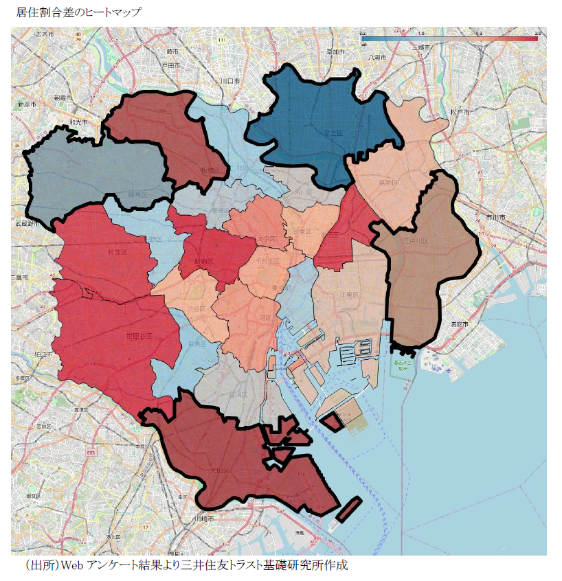 - 若年層の居住区の割合を住宅補助金の有無でそれぞれ集計したところ、住宅補助金を受給している世帯は西部から南西部にかける地域に居住している割合が非受給世帯と比べて高く、北部の足立区や北区では低い傾向が見られる。