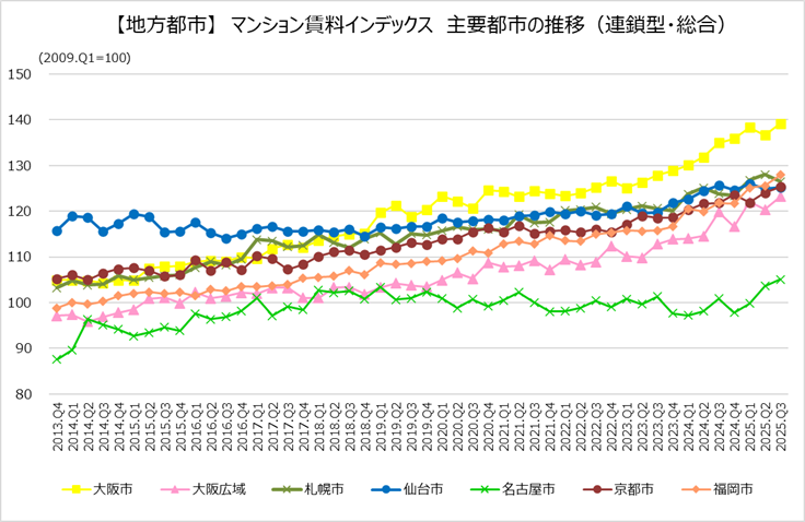 2025年Q3の賃料(連鎖型・総合)は、仙台市を除き前年同期比プラスとなっており、+2.0pt以上の賃料上昇となっている。夏から秋にかけては、企業の人事異動に加え、一部大学の秋入学制度による留学生の人口流入があり、大都市圏では賃貸需要が底堅く推移した。東京・大阪・名古屋の3大都市のほか、横浜・川崎・福岡の需給もひっ迫しており、賃料は引き続き上昇している。