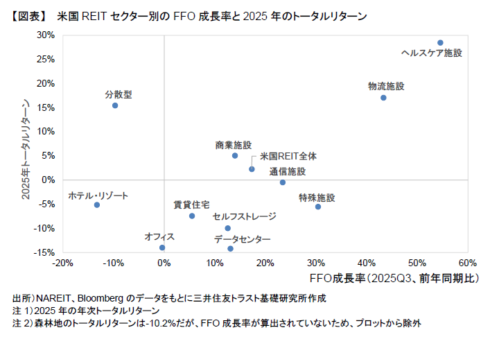 図表は横軸に2025年Q3のFFO成長率(前年同期比)、縦軸に年初来トータルリターンをセクター別に示したものである。2025年の米国REITトータルリターンはヘルスケア施設(+28.5%)、物流施設(+17.0%)、分散型(+15.5%)、商業施設(+5.1%)が米国REIT全体を上回った一方、データセンター、オフィス、セルフストレージ、賃貸住宅、特殊施設、ホテル・リゾート、通信施設が米国REIT全体を下回っている。総じて、パフォーマンスが好調(不調)なセクターのFFO成長率は概ね高い(低い)と言える。