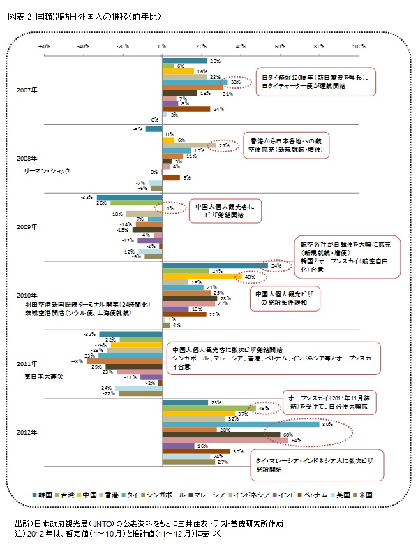 2012年の訪日外国人の国籍内訳は、韓国(24%)、台湾(18%)、中国(17%)と上位3位をアジアが占め、4位が米国(9%)である。各国の推移を追ってみると、米国、英国、フランスなど欧米からの訪日需要は、震災の影響から回復してきているものの震災前の水準には達しておらず、拡大余地を残している。これに対して、アジア勢の回復には勢いがあり、7カ国(台湾、中国、タイ、マレーシア、インドネシア、インド、ベトナム)が過去最高記録を更新した。7カ国の中には、数年間何度も訪日できる数次ビザの発給が始まったタイ、マレーシア、インドネシアが含まれていることから、今後これらの国々からのリピーターによる需要の底上げにも期待が持てる。なお、中国は、年間数では過去最高を記録したが、尖閣諸島問題の影響で2012年後半に大きく落ち込み、回復の兆しが見えない状況が続いている。