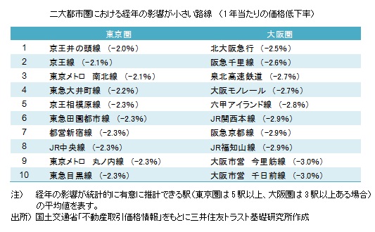 中古マンションの取引価格情報をもとに、築年数が価格に及ぼす影響度合いを東京圏および大阪圏の鉄道駅ごとに評価した。築古になっても中古マンションの取引価格が下がりにくい、すなわち築年が1年古くなることに対する価格の低下率が小さい(経年劣化の影響が小さい)駅を集計すると、都心ターミナル駅へのアクセスに優れた路線の沿線や、東京圏の都心部および大阪圏の北摂地域を通る路線の沿線が多い結果となった。
