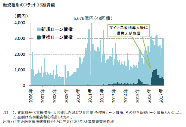 - 低金利を背景に、住宅ローンの借換えは、フラット35以外の民間住宅ローンも含めて2016年度に10兆円規模に上ったと試算される。ただし、長期金利は2016年半ばを底に下げ止まっており、2010年から2014年の間に融資された住宅ローンの借換えが一巡すれば、借換えラッシュは終息に向かうものと考えられる。