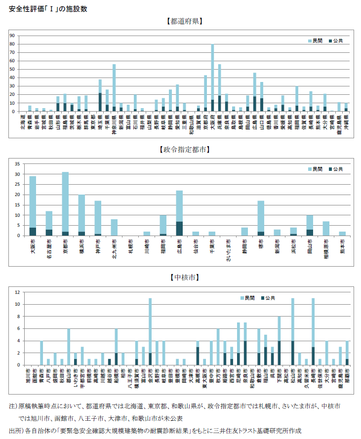 昨年(2016年)末頃から、各自治体が一斉に「要緊急安全確認大規模建築物の耐震診断結果」を公表し始めている。これは、1981年5月31日以前に建築された、不特定多数の者が利用する一定規模以上の建築物について耐震診断を実施し、その結果を公表しているものである。本稿ではこのうち、震度6強から7程度の大規模地震で倒壊または崩壊する危険性が高いとされる安全性評価「Ⅰ」の施設を集計し、自治体間での比較や全体としての傾向を考察した。さらに、こうした施設におけるCRE/PRE戦略の可能性も追求した。